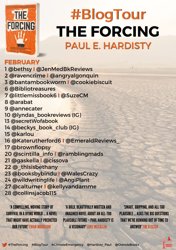 This is a hard book to review. The Forcing takes place in a world where a climate emergency was inevitable, disaster was just around the corner, the population had reached 13 billion, one third of the animals had become extinct, the seas were full of toxic waste and we did nothing. All those older than the prescribed age (ie born before 1990) were deemed responsible for the current state of the world, and were to be ‘relocated’, their property and assets confiscated. It is probably the first time I have read a book that blames the millennials rather than the boomers for the state of the earth.