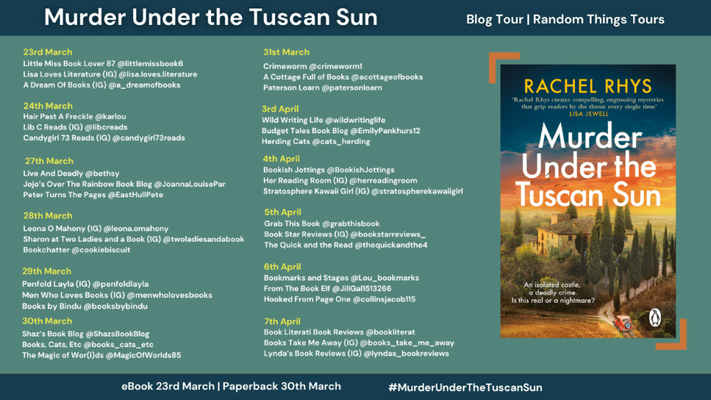 #MurderUnderTheTuscanSun #RachelRhys #RandomThingsTours @annecater @RandomTTours #blogtour