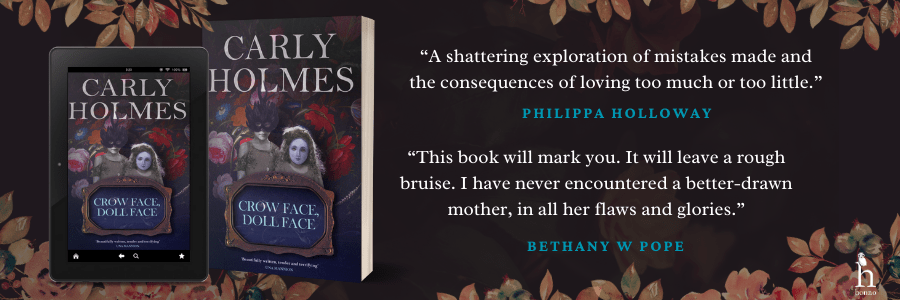 Carly Holmes lives and writes on the banks of the river Teifi, west Wales. Her debut novel The Scrapbook was shortlisted for the International Rubery Book Award, and her Literary Strange short story collection Figurehead was published in limited edition hardback by Tartarus Press, and reprinted in paperback by Parthian Books. Her prize-winning short prose has appeared in journals and anthologies such as Ambit, The Ghastling, The Lonely Crowd, and has twice been