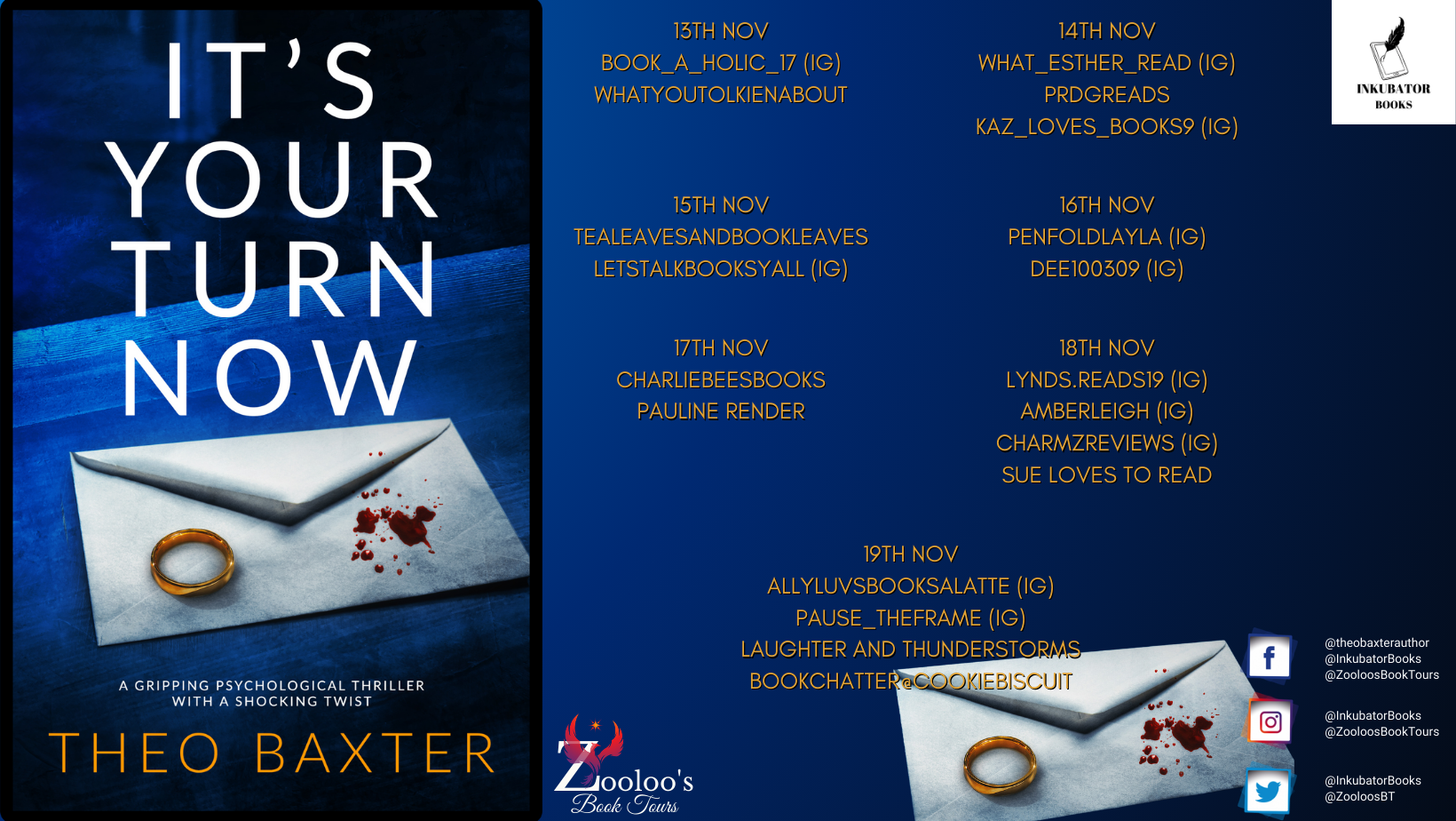 Twitter/X #ItsYourTurnNow #TheoBaxter @inkubatorbooks @Zooloo’s Book Tours @zooloo2008 #ZooloosBookTours #blogtour Instagram @zooloosbooktours @inkubatorbooks