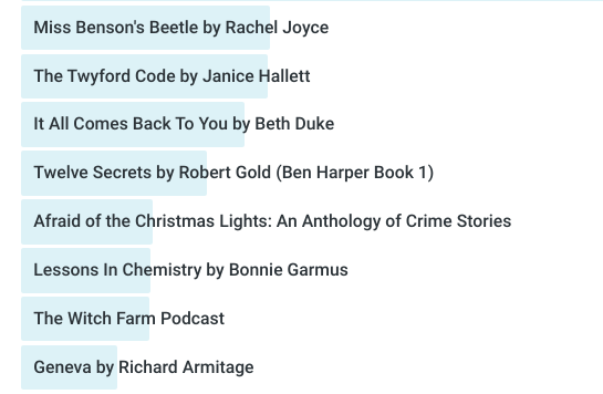 This was a new one for me last year, but I do love a good list. These books were not necessarily published in 2023 – in fact Miss Benson’s Beetle has been top for the last three years.