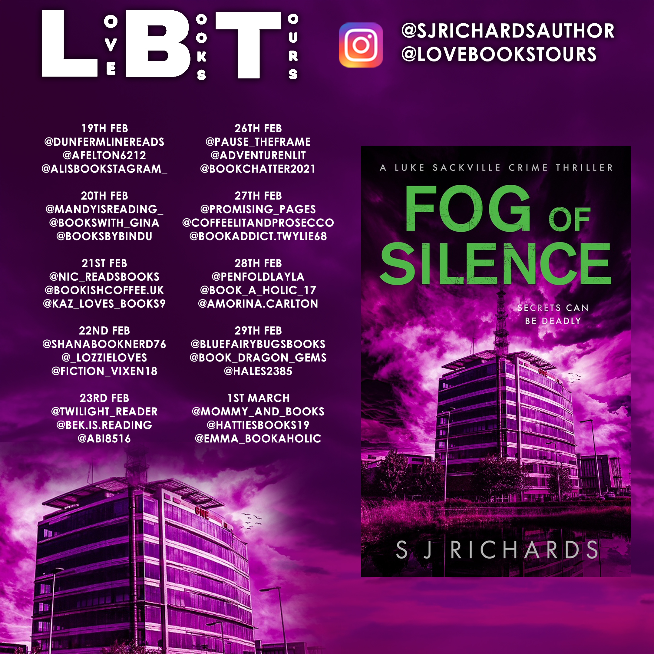 X (Twitter) #FogOfSilence @Srichardsauthor @KellyALacey @lovebookstours #Ad #LBTCrew #BookTwitter Instagram @SJRichardsauthor @lovebookstours #Ad #LBTCrew #bookstagram