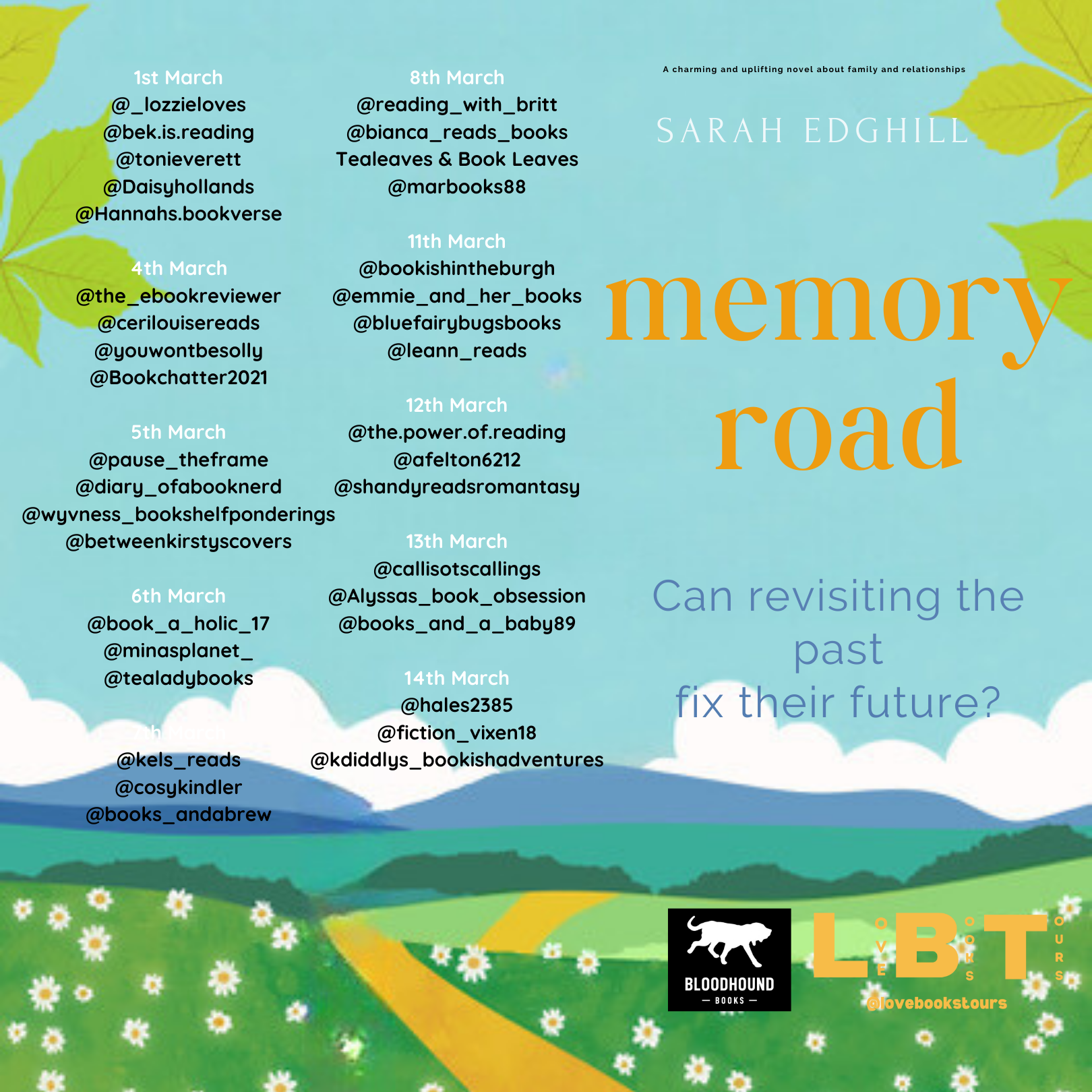 X (Twitter) #MemoryRoad @EdghillSarah @bloodhoundbook @KellyALacey @lovebookstours Instagram @sarah.edghill @bloodhound.books @lovebookstours