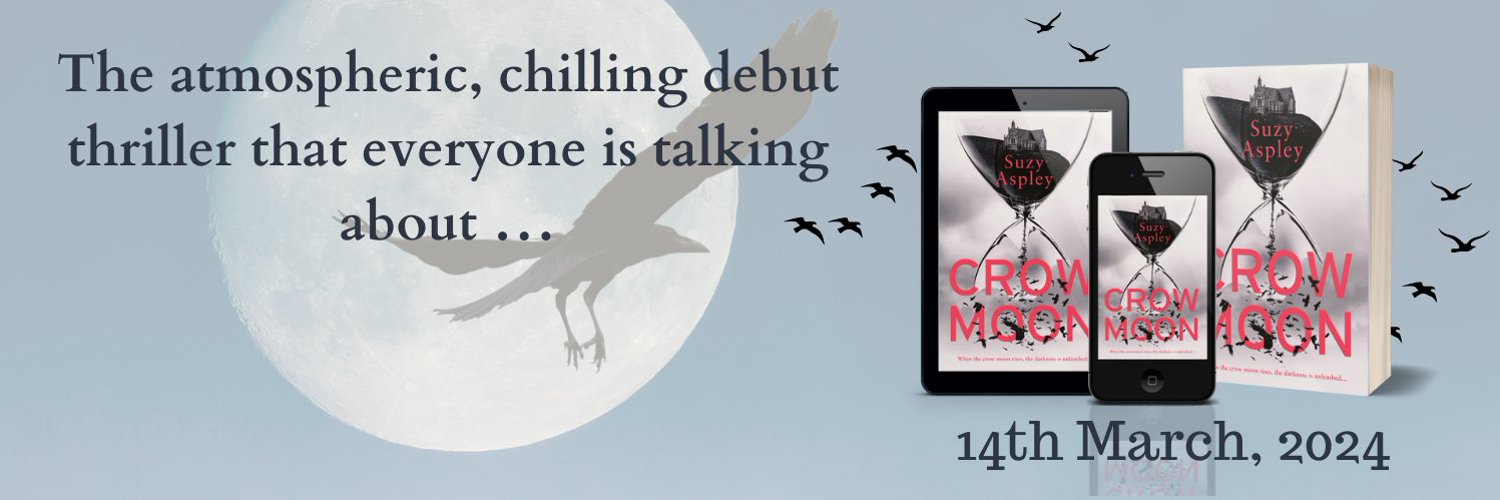 Originally from the north-east of England, former journalist Suzy Aspley has lived in Scotland for almost thirty years. She writes crime and short stories, often inspired by the strange things she sees in the landscape around her. She won Bloody Scotland’s Pitch Perfect in 2019 with the original idea for her debut novel and was shortlisted for the Capital Crime New Voices Award. In 2020, she was mentored by Jo Dickinson as part of the Hachette future bookshelf initiative. Crow Moon was also longlisted for the Caledonia Novel Award. She’s currently working on the second book in the series, and when she’s not writing, she’s either got her nose buried in a book, or is outside with her dogs