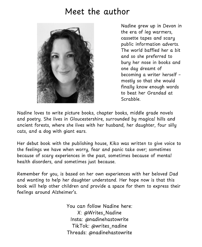 Remember for you, is based on Nadine Holland’s own experiences with her beloved Dad and wanting to help her daughter understand. Her hope now is that this book will help other children and provide a space for them to express their feelings around Alzheimer’s.