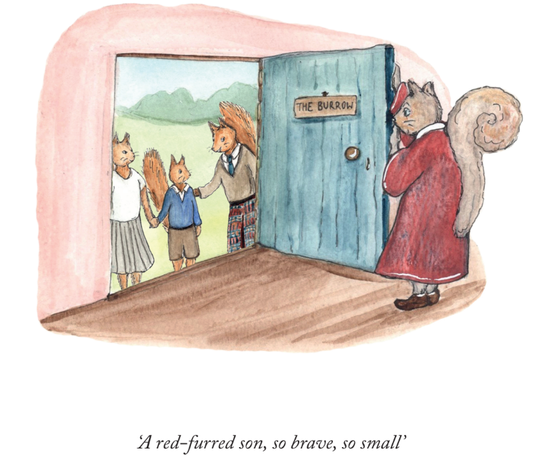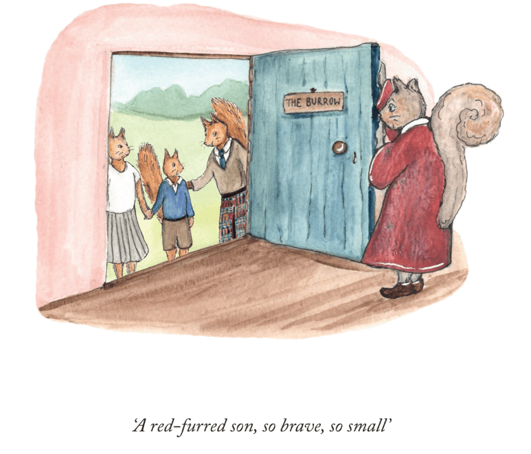But when Rufus the red squirrel arrives, it is obvious that he is descended from the Founder of the school. But is he the red-furred son, so brave, so small? Being a well-mannered, intelligent squirrel, he soon fits in and makes friends, in spite of being much smaller and ‘different’. He is very good at writing – his father is a journalist, and editor of The Inverness Chatter – and football, though not very good at other sports or academic subjects.