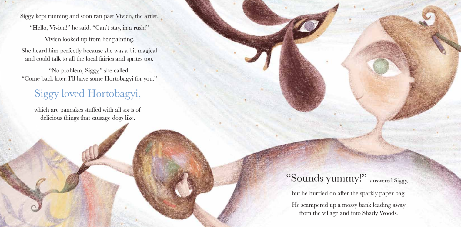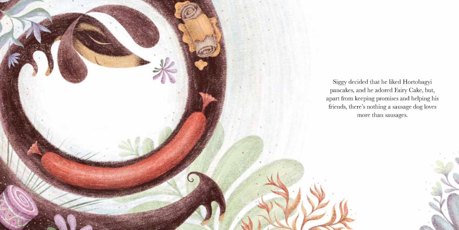 And so it went on, until Siggy caught up with the bag. He was so pleased that he could give it back to Mrs Chana. There was so much food he loved, and Siggy decided that he liked Hortobagyi pancakes, and he adored Fairy Cake, but in the end there is only one thing a sausage dog likes best and that is, of course, sausages.